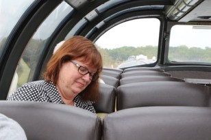 Our accommodations onboard were two single berths across the aisle from each other. (That’s me below in my cabin in a picture taken by Holly in her cabin.) We would have preferred one two-person cabin, but VIA offered a two-for-one sale on single cabins, saving us over $2,000 so the decision to take two singles wasn’t hard. And honestly, we were very happy with the single cabins. Mostly, except for sleeping, your time onboard is spent in the club car, usually upstairs in the dome where there are 360 degree views of the scenery, or in the dining car for meals. (Below are two pictures of Holly in the dome of the club car.)