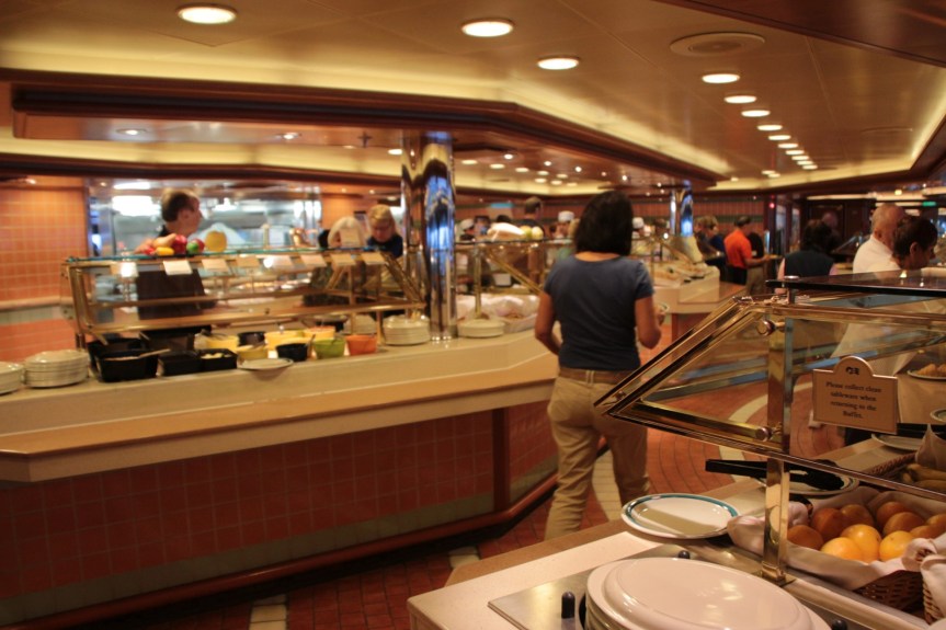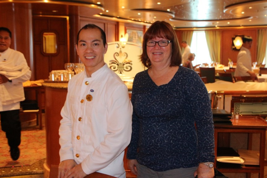 Holly with one of our waiters in the “International Dining Room”. This dining room has traditional cruise dining with assigned tables and seatings for dinner. We are “anytime diners”, we don’t have a specific dining room and time for dinner. The International Dining room is open dining for breakfast and lunch. I’ve also attended a couple of wine tastings here. Mostly we are eating our dinner in the three dining rooms designated for anytime dining. There are two specialty dining room, a steak house and an Italian dining room that are also available for anytime dining, but require an additional fee. We enjoyed the steakhouse, but did not find the Italian dining room to be particularly good, and certainly not worth the additional $25 fee each.