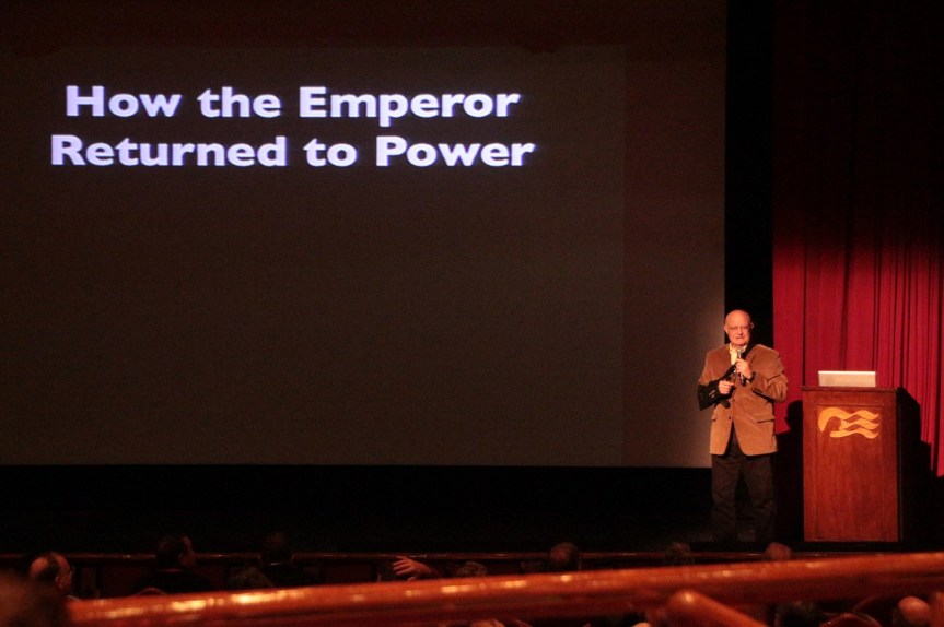 I’ve fallen into a pattern of attending back-to-back lectures in the morning at the Princess Theater. The first lecture is a “Port Talk” with Heather Hopkins Clement. Heather provides practical information about the upcoming ports we will visit. What to do, see, buy, eat, etc. The second lecture is a very interesting lecture series on the history of Japan by Dr. Jim Leavell. He presents his information with humor and tells the story of the development of Japan from 1600 to the 20th century as cohesive, entertaining story.