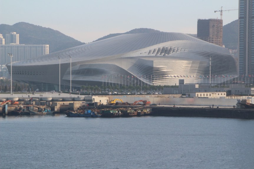The Diamond Princess docked immediately opposite the Dalian International Conference Center and Opera House built in 2012 as part of the redevelopment of the waterfront (it’s the futuristic building below).