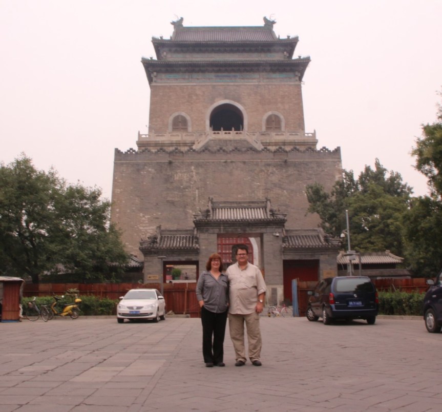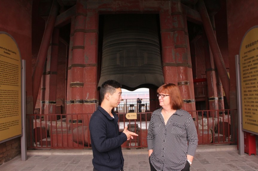 The bronze bell in the Bell Tower is 500 years old and weighs 63 tons. Our guide hired a local guide who lives in the Hutong to show around, here he is with Holly in front of the bell: