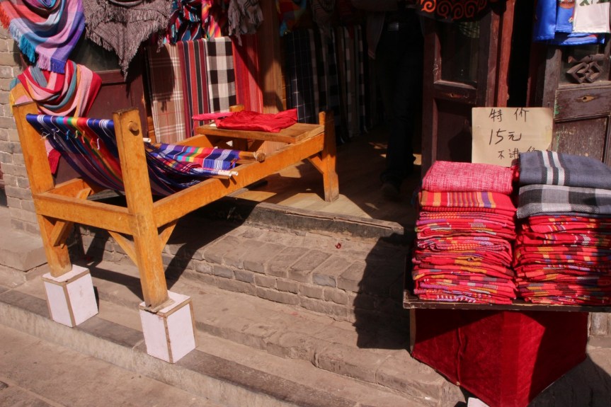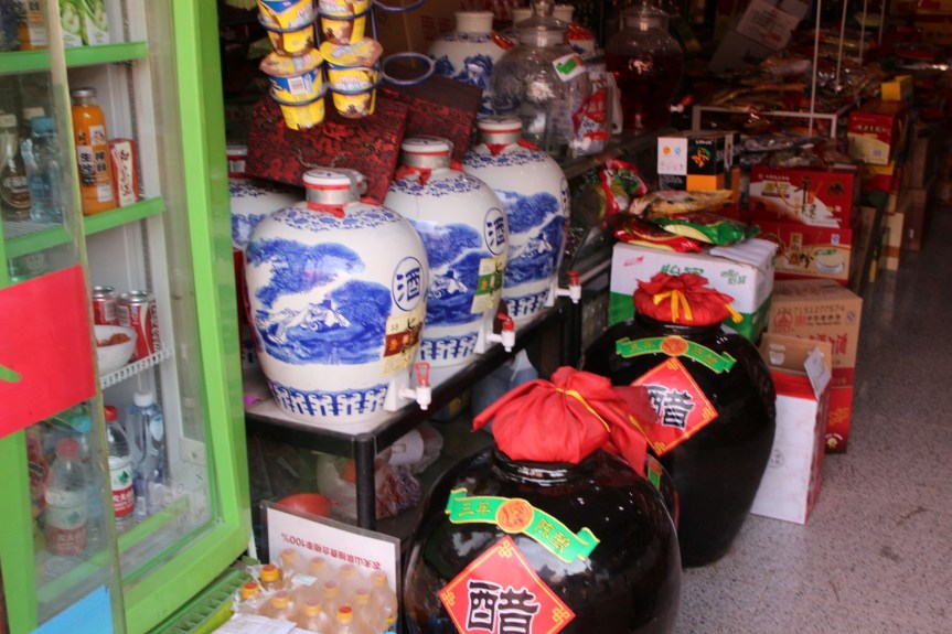Commerce is alive in Pingyao – mostly directed at the Chinese tourists, as it is not on the radar of most European and American travelers. I am including this photo for my dear neighbor, Maryann Lange. Many shops had these looms out front and where selling their hand-woven shawls for 15 yuan (about $2.50 U.S.). Colorful and intriguing, the small food stores had these large urns filled with vinegar and local liquor – you would bring your container from home to have them filled from the urns. Our guide told us that the liquor was similar to Kentucky White Lightening