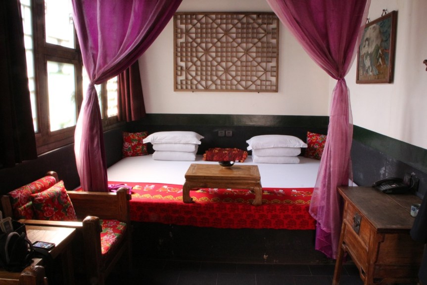 So fun to stay in our hotel – Tian Yuan Kui Guesthouse. A local hotel made from several traditional courtyards put together, the pathways through the courtyards were lovely and our room oozed quaintness. Below is the outside of the hotel at night, our room, and a shot down the street from the hotel front door. If you are tall, be sure to stay her – the bed was so big that I couldn’t touch both ends at the same time. We also enjoyed having the best wifi connection since we left Vancouver – able to Skype with my daughters(when our times aligned) and poke around on Pinterest.
