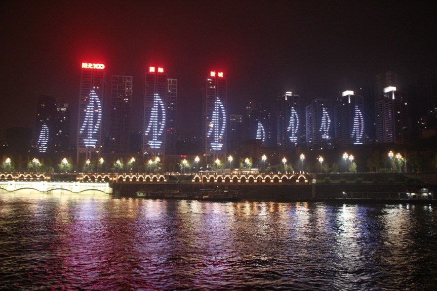 Chongqing is the largest city in the world and the skyscrapers seem to go on forever. It was hazy the night we left so my photos of the skyline at night is not very clear. I did get a photo of this section of the buildings that had a coordinated recurring light show, the lights on each building into the shape of sailing ships.