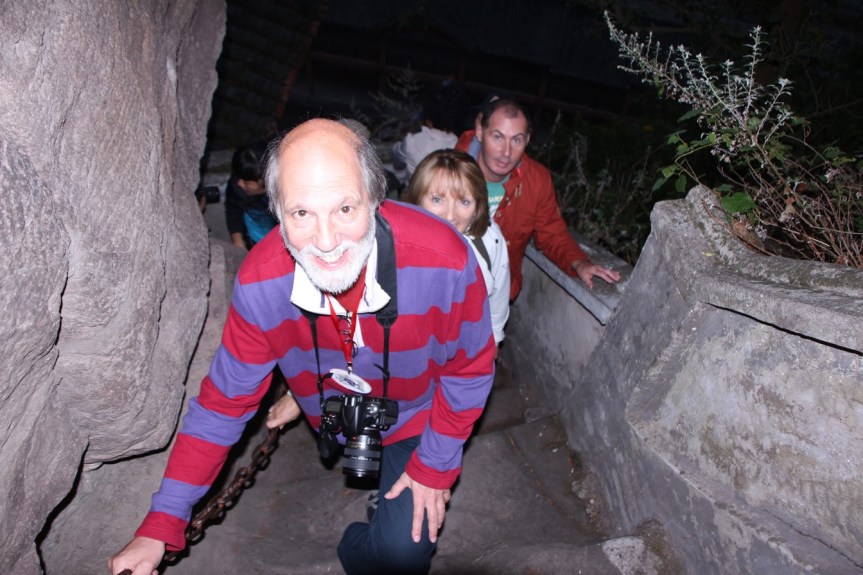 A nine-story wooden pagoda was added in 1819 so that monks and visitors would not have to suffer the discomforts of the chain ascent. The Pagoda was built entirely of wood, with no nails and many of its timbers rest on the rocks of the cliff face. We were informed that almost all of the wood in the Pagoda is original construction. We climbed up the wooden Pagoda most of the way, but the last little bit, we climbed the traditional way using the stairs cut into the rock and the iron chain. Here we are in front of the Pagoda: