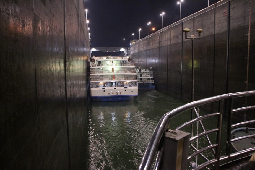 After the excursion up the Shennon Stream, we re-boarded the Victoria Katarina about dinner time and resumed our trip down-river to the Three Gorges Dam. We arrived at the ship locks of the dam about 10 p.m. As we arrived we could see the two sets of locks, one for traffic moving down-river on the right and one for traffic moving up-river on the left.