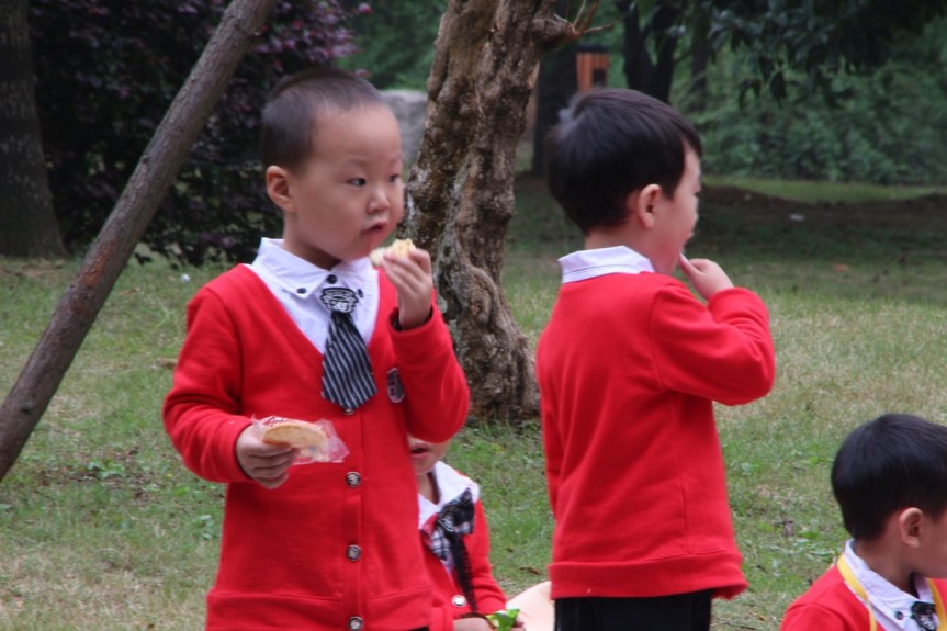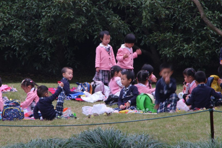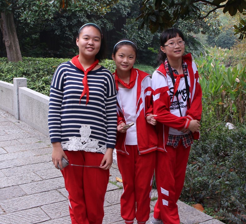 After visiting a silk factory and learning a bit more about silk production (not a great stop – really a sales pitch), we visited our last park – No. 2 Park for Hubin Road. Believe me, it was much prettier than the name implies. It happened to be the days the local schools were having their holiday – what we would call a field trip. There is one school holiday per semester as required by the central government. Mark could hardly enjoy the park for my asking him to take pictures of the various school groups – love their uniforms!