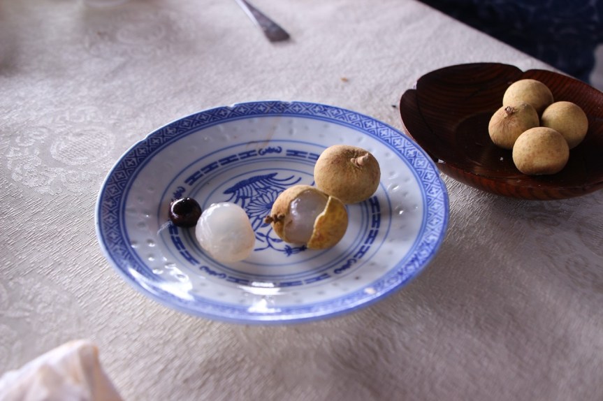 To my delight, we were given fresh Lychees along with our lunch. After miming to the waitress to figure out how to eat these strange rough brown balls served to us, I found a delight inside. Here’s a photo of an unpeeled Lychee (really fruit not a nut), half peeled, ready to eat, and the beautiful, shiny, mahogany colored seed. While canned Lychee are tasty – the fresh ones win hands down. Unfortunately these are from southern China, so I only got them a few times.