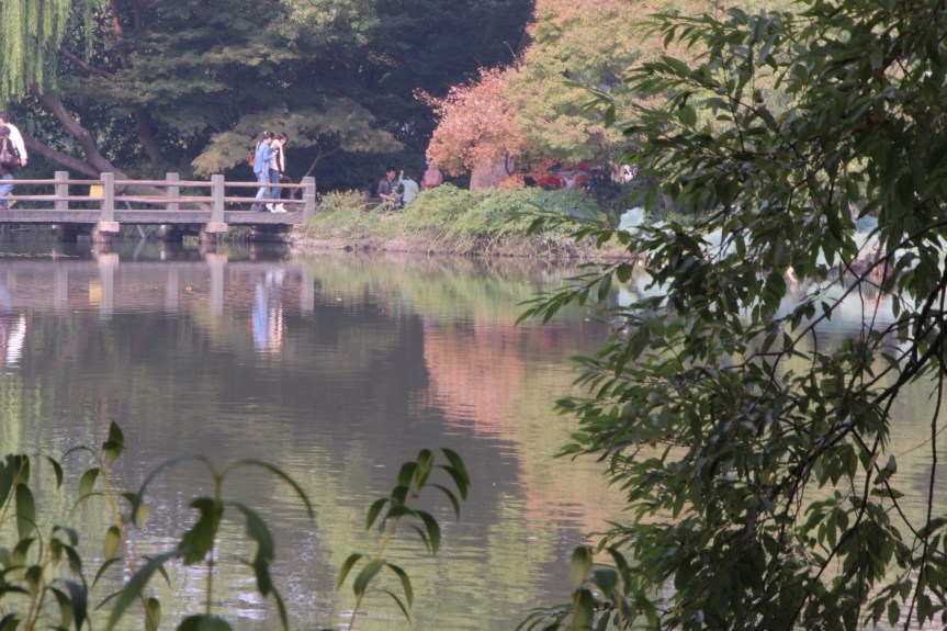 Hangzhou is a vacation destination for the Chinese. A huge modern city (population over 7 million) at the shores of a large, scenic lake (West Lake), many gardens and parks, and a famous tea growing area not far away (proudly proclaimed as one of the three best tea areas in all of China – thanks to a high alkaline level in the soil). When President Nixon came on his historical visit to China in 1972, he was brought to Hangzhou for a visit prior to the official meetings. Over the next 48 hours we would visit 6 parks or nature areas – relaxing and beautiful. Mark and I caught one of the West Lake Pleasure Boats out onto the lake and got off on the first island (of many) to poke around. I just love the names of places here – the island we visited is named “Three Pools Mirroring the Moon” island. While we missed the moonlight, you can see the charm: