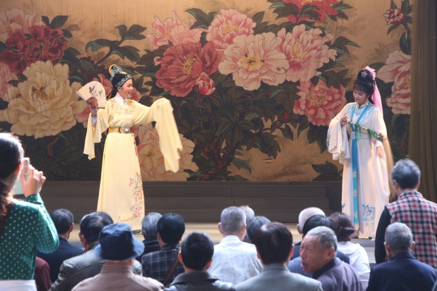 Caught a short bit of Chinese opera Southern Style in an open air theater at the park. The main distinction from Beijing (Northern) style, is that all parts in Southern style are played by females. Northern Style is just the opposite – all parts played by men. The local opera school puts on short (30 minute) scenes in part to allow their students to have practice before an audience. As you can see in the bottom of the photo, many senior citizens were there and were clearly regulars. They clapped loudly whenever a particular singer met their approval. Oh, and that’s the male character in the light yellow dress holding the fan – men carry the fans to show their high education and personal refinement. The female character is holding a “broom” and the headdress is a different shape.
