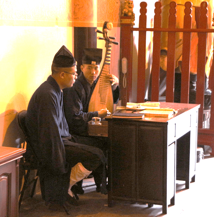The thing that caught my attention and reduced my “Temple Fatigue”, was this monk, sitting just to the left of the City God pictured above who was beautifully playing this instrument. His playing was lovely and really added to the experience of visiting this temple.