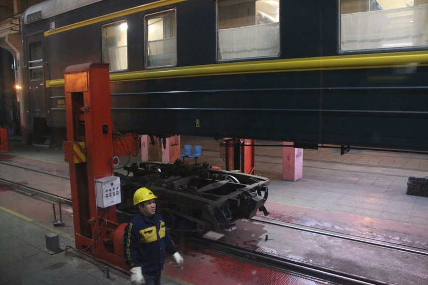 One of the most interesting parts of this trip, was the crossing from China into Mongolia. We arrived at the border crossing about 10 p.m. and there they change the “bogies” (the wheels on the carriages) because the gauge of the track (the distance between the rails) is different in China and Mongolia. To accomplish this, they take the train carriages into nearby sheds, hoist the carriages up with lifts, roll away the Chinese bogie and roll in the Mongolian bogie. Then they lower the carriage down, put the train back together and continue on. The whole process took about 3 hours and we didn’t leave the Mongolian border until after 1:00 a.m. Here’s a picture of the carriage lifted up: