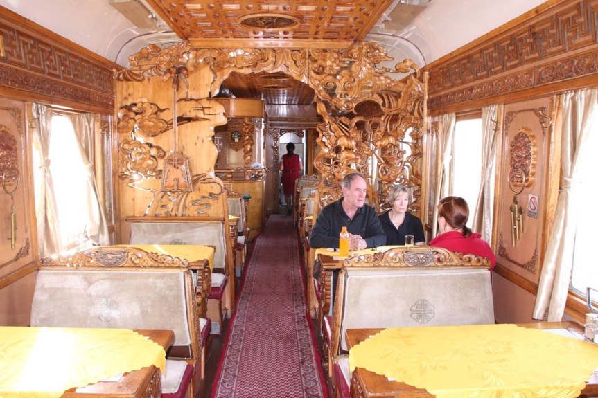 Also, at the border the Chinese dining car was replaced by a Mongolian dining car. We read in the guide books that these dining car concessions are run by families. Here’s a picture of the Chinese dining car followed by the Mongolian dining car, notice the elaborate wood carvings in the Mongolian dining car: