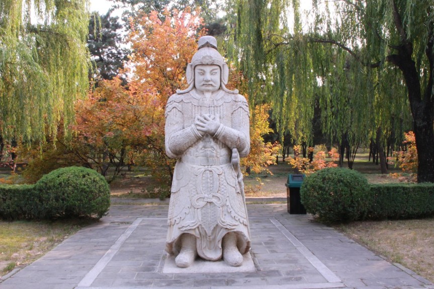 Immediately to the south of the Ming Tombs is The Sacred Way, the original road leading up to the temple, which is bordered on each side by pairs of stone statues of animals and human officials to guard the temple and the tombs.