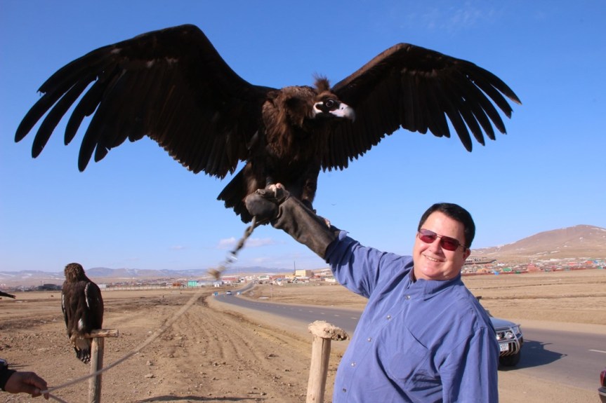 After our time in Ulaanbaatar, we headed to the Terelj National Park, about 80 km east of Ulaanbaatar. On the side of the road as we traveled into the countryside, there was a small concession set up, with items for sale spread out on a blanket and birds and reindeer available for photographs. I took the opportunity to have my picture taken with this vulture and also a golden eagle.