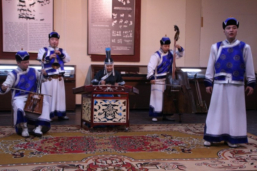 and musicians with traditional instruments, along with Mongolian Throat Singing. If you’ve never heard Throat Singers, do NOT pass up the opportunity. It’s really interesting. Here’s a photo of a Mongolian throat singer (on the right) and musicians. Note the Mongolian Horse Head Fiddle on the left, a two stringed instrument; the musician’s fingers are both under and over the strings, not just on top of the strings like a guitar or a European violin. The lady in the middle is playing a stringed instrument, like a harp set on its side but played like a xylophone.
