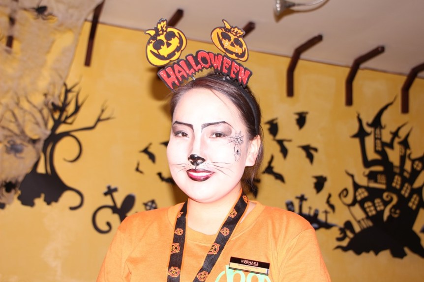 Damidaa then took us to a Mongolian Barbeque restaurant, which would be indistinguishable from any Mongolian Barbeque joint in the United States. Our first day in Mongolia was October 31st and we discovered that some westerns holidays, including Halloween have been adopted by Mongolians, at least in the capital. The restaurant was fully decked out in Halloween decorations and the staff was all in costume. There was even person doing very elaborate face makeup. Here’s a photo of our very friendly waitress: