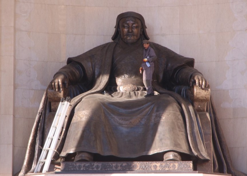We spent the night at the Ulaanbaatar Hotel, just a block away from the main square – Sukhbaator Square, named for Damdin Sukhbaatar one of the leaders of the 1921 Mongolian revolution, whose statue seated on a horse dominates the square. On the north end of the square is this large structure built to celebrate the 800th anniversary of the founding of the Mongol Empire. Just behind this structure is the Mongolian Government Palace (Parliament building). The central statue in the structure pictured below is Ghengis Khan (in Mongolia it’s spelled and pronounced: Chinggis Khaan). Chinggis is flanked by his successors as the great Khan – his son Ogedei and grandson Kubai Khan who founded the Yuan Dynasty in China.