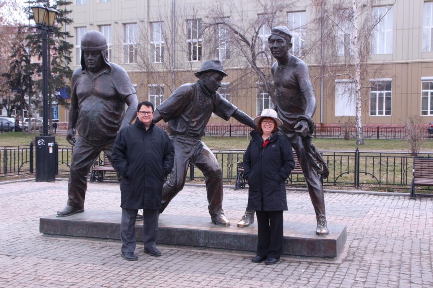 On a lighter note, a famous film maker from the Soviet period was raised in Irkutsk and is a home town favorite. Here is a statue of Mark and I with 3 of his recurring characters … like the Marx Brothers or Laurel & Hardy. We ate dinner that night at a restaurant that has a “retro” soviet motif and saw parts of a movie with these characters as the stars. For those old enough, besides soviet kitsch, there were 2 large frames filled with cassette tapes on the walls and a wall hanging with box cameras and old camera paraphernalia. Thanks to a sweet spirited waiter we had a lovely meal he worked so hard to communicate with us in English. At that point we decided to make up with Russia that we could enjoy it after all.