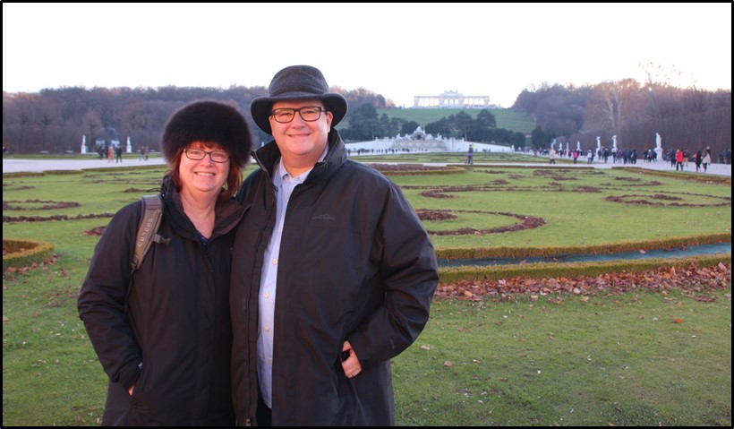 Here is a photo of us in the gardens of the Schonbrunn Palace. I have a feeling in the summer there are beautiful flowers blooming and the fountains flow freely.