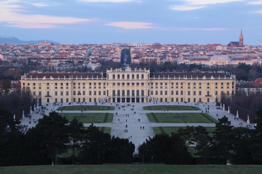Schonbrunn Palace and the palace gardens from the Gloriette with Vienna in the background. St. Stephen’s Cathedral can be seen on the horizon on the right.
