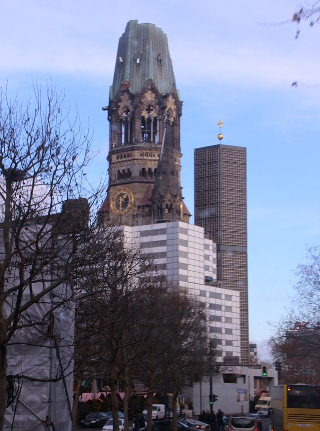 Below, the modern Gedachtniskirche is built adjacent to the tower of a church built between 1891 and 1895 in memory of Kaiser Wilhelm I. The church mostly destroyed during WWII, except portions of the tower, retained as a reminder of the devastation of war.