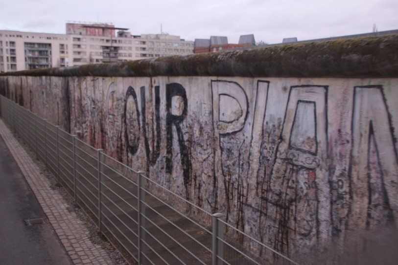 Here’s a section of the former Berlin Wall that divided East and West Berlin until the fall of the Soviet Union. Notice the round pipe shape on the top – barbed wire can be gotten through, but this rounded top made the wall almost impossible to and climb over.