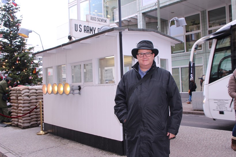 Mark in front of “Checkpoint Charlie”. This was the checkpoint used by all non-Berliners crossing between East and West Germany during the Soviet times.