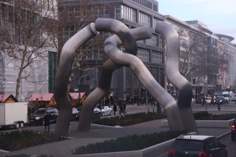 This seems to be the appropriate time to mention how shockingly new (at least to Mark and me) Berlin is. We knew in theory that Berlin had been flattened during WWII, but in other cities that has meant a significant mixture of old and new. (I, of course, had the image from my student visit – dark, gloomy, broken down with soviet era apartment blocks on the east side.) In Berlin today, there was way less old – and a significant part of the “old” are almost complete reconstructions. In addition there seemed to me to be more “experimental” new. For example, here’s a link to architecture of the Nordic Embassies http://www.nordicembassies.org/felleshus/ and here‘s a photo of a piece of art work along a boulevard: