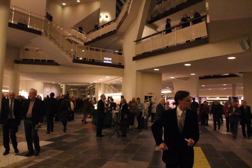 The theater itself is amazing. Designed so that no seat is far from the stage and for the maximum acoustically effects, is different from any philharmonic theater I have been in – basically it’s a theater in the round. You can’t see it from this photo, but there are probably 15 to 20 mics hanging down over the center stage for recording the performance. The cameras are all around on the sides. The performance is simulcast to movie theaters in various cities in Germany.