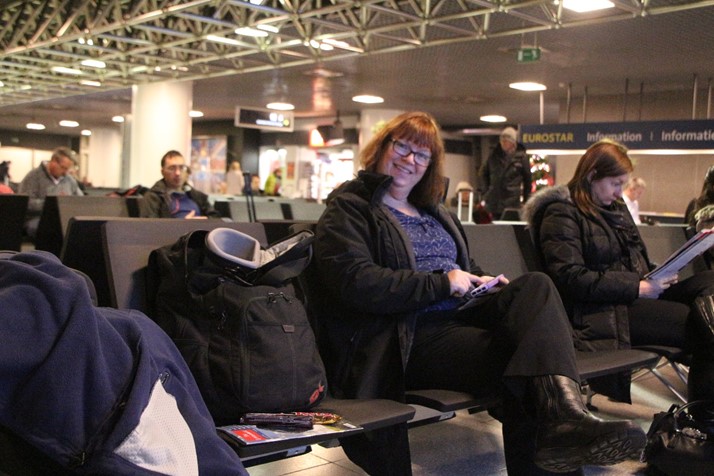 We traveled from Amsterdam to London via train with a change of trains in Brussels, Belgium. Of all our travels on this trip around the world, we have not passed through a country without stopping. Unfortunately in Brussels, we only saw the inside of the train station. Here Holly waits in the Eurostar lounge of the Brussels train station.