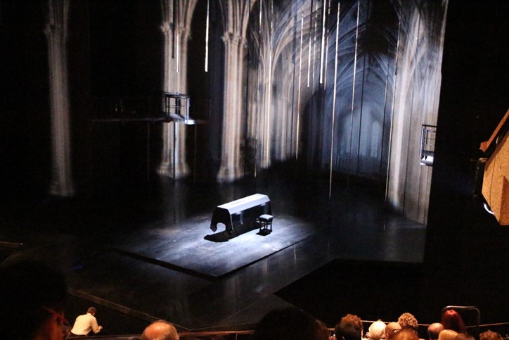 When Shakespeare’s Richard II opens, the King’s Uncle, the Duke of Gloucester has been murdered. Here’s a photo of the stage set with the Duke’s coffin prior to the beginning of the show.