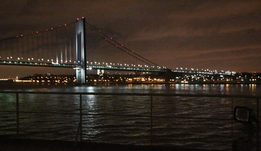 Finally before dawn the morning of the seventh day of the cruise, we arrived in New York only one hour behind our scheduled arrival time. It was remarkable that the ship was able to make up so much time despite deviating south from the planned route to avoid worse weather. We sailed into New York harbor beneath the Verrazano-Narrows Bridge which connects Staten Island to Brooklyn. Although, it was probably just my perspective, it seemed that the top of our ship barely cleared the bottom of the bridge. Here’s my photo of the Verrazano Bridge:
