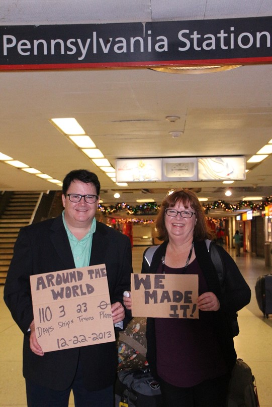 We had asked our cabin steward to find us some cardboard we could use to make signs for our final pictures. We spent about half an hour walking around Penn Station with our luggage and these signs asking strangers to stop and use my camera and Holly’s iPhone to take pictures of us. People would walk by, read our sign, and then stop and talk with us and ask us questions about our trip. It was fun and the attention we drew made us feel like celebrities for a few minutes. The signs read: