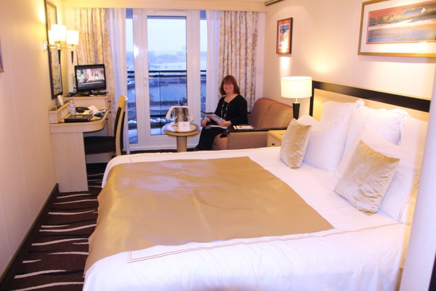 We had a nice stateroom with a balcony on deck 11. Our stateroom was very comfortable and this room is actually much larger than our hotel room in London, so we were pleased. By the way, please don’t refer to staterooms as “cabins”. Here Holly settles in and we prepare to enjoy a bottle of champagne left in our stateroom by Cunard to welcome us aboard.