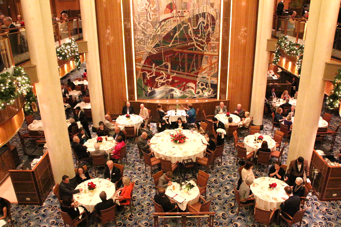Here’s the Britannia Dining Room from the second level. Our table is immediately to the right of the large round table in the middle of the room. Holly is sitting alone at our table in this picture with her back to the camera.