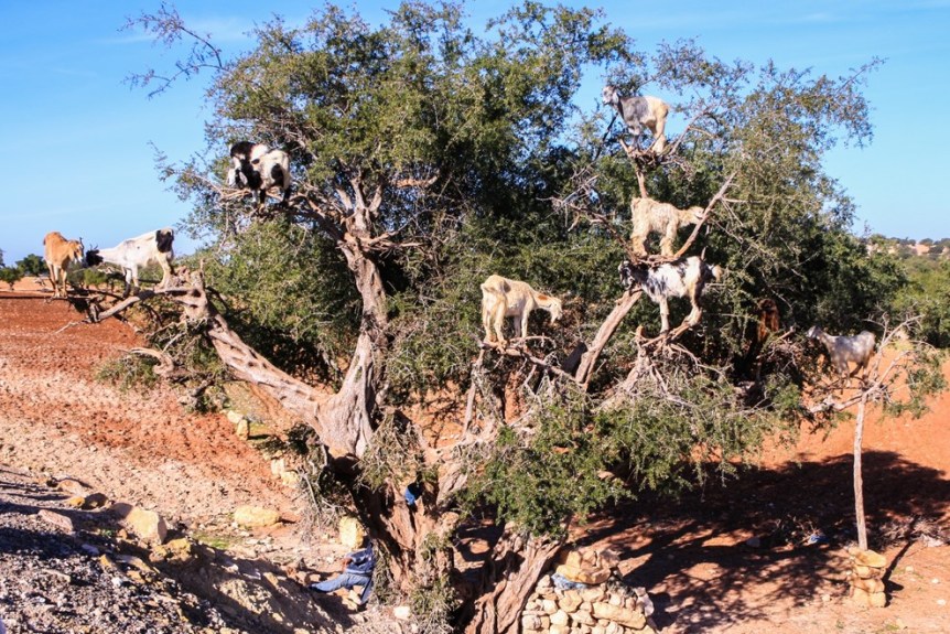 We hired a minivan and a driver for a day trip from Marrakesh to Essaouira. The highlight of the day came about 75% of the way, when our driver pulled over to the side of the road to see the “Goat Trees”. He told us (with tongue in cheek) that goats like to eat the nuts of the Argon tree and sometimes climb up in the trees to get to the nuts.