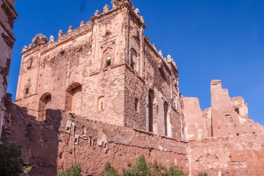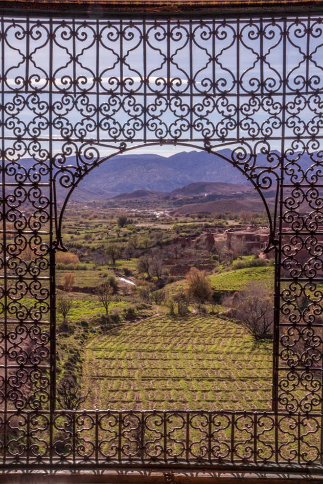 From Fodor’s Morocco: “…Most of the Kasbah looks ravished, as though most of the useful or interesting bits had been carried off when the Glaoui reign came to its abrupt end in 1956. This sense of decay is interrupted, however, when you get upstairs; here, from painted wood shutters and delicately carved plaster arabesques, exquisitely set tile and broad marble floors, you get a taste of the sumptuousness the Gllaoui once enjoyed. Because it was built in the 20th century, ancient motifs are combined with kitschy contemporary elements, such as traditionally carved plaster shades for the electric lights. The roof has expansive views.”
