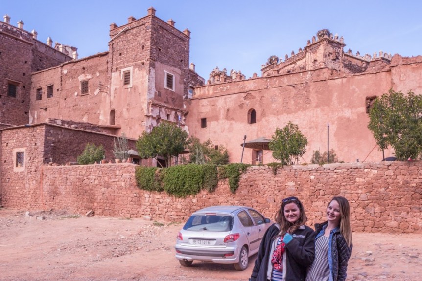 Natalie and Rebecca in front of the Glaoui Kasbah at Telouet: