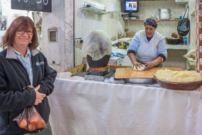 We spent a fair amount of our time in Fes, shopping in the souk. Portions of the souk are food markets, with all sorts of food for sale. One we found interesting was a very thin pastry made by taking a small of dough, rolling it really thin and cooking it by placing the dough sheet on a heated round object. Holly below is admiring this woman’s considerable technique: