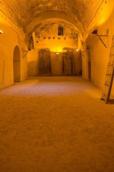 From Fodor’s Morocco: “The Royal Granaries were designed to store grain as feed for the 10,000 horses in the royal stables – not just for a few days or weeks but over a 20-year siege if necessary. Ismail and his engineers counted on tree things to keep the granaries cool enough that he grain would never rot: thick walls (12 feet), suspended gardens (a cedar forest was planted on the roof), and an underground reservoir with water ducts under the floors. The high-vaulted chamber on the far right as you enter has a 30-foot well in its center and a towpath around it – donkeys circulated constantly, activating the waterwheel in the well, which forced water throught the ducts and maintained a stable temperature in the graneries.”
