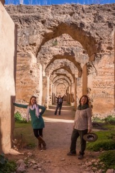 Moulay Ismail Mausoleum: Again from Fodor’s Morocco: “One of four sacred sites in Morocco open to non-Muslims this mausoleum was opened to non-Muslims by King Mohammed V in honor of Ismail’s ecumenical instincts. An admirer of France’s King Louis XIV – who, in turn considered the sultan an important ally… The mausoleum’s site once held Meknes’s Palais de Justice (Courthouse), and Moulay Ismail deliberately chose it as his resting place with hopes he would be judged in his own court by his own people. The deep ochre-hue walls inside lead to the sultan’s private sanctuary, on the left, heavily decorated with colorful geometric zellij tiling. AT the end of the larger inner courtyard, you must remove your shoes to enter the sacred chamber with Moulay Ismail’s tomb, surrounded by hand-carved cedar-and-stucco walls, intricate mosaics, and a central fountain.” (Natalie, Rebecca and Holly by the central fountain.)