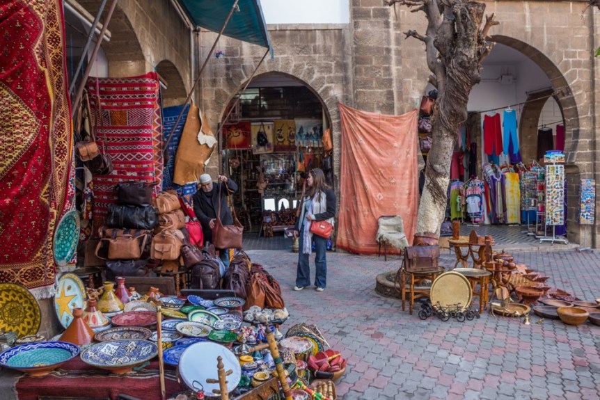 From Fodor’s Morocco: “Terrasse des Tanneurs. The medieval tanneries are at once beautiful, for their ancient dyeing vats of reds, yellows, and blues, and unforgettable, for the nauseating, putrid smell of rotting animal flesh on sheep, goat, cow, and camel skins. The terrace overlooking the dyeing vats is high enough to escape the place’s full fetid power and get a spectacular view over the multicolor vats. Absorb both the process and the finished product on Choura Lablida, just past Rue Mechatine (named for the combs made from animals’ horns): numerous stores are filled with loads of leather goods …” “…One of the shopkeepers will explain what’s going on in the tanneries below – how the skins are placed in successively in saline solution, lime, pigeon droppings, and then any of several natural dyes: poppies for red, turmeric for yellow, saffron for orange, indigo for blue, and mint for green. Barefoot workers in shorts pick up skins from the bottom of the dyeing vats with their fee, then work them manually. Though this may look like the world’s least desirable job, the work is relatively well paid and still in demand for a strong export market.”