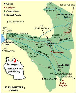 We drove from Lake Victoria to Serengeti National Park, entering through the Ndabaka entrance at the extreme western end of the park to the Tumbili campsite (located roughly at the green triangle next to the red dot labeled Seronera on the map below).