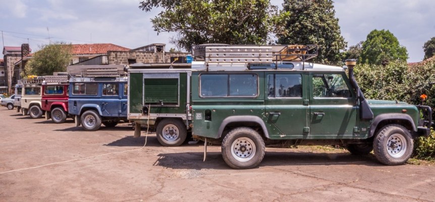 Here’s our Defenders lined up in the Tea Hotel’s parking lot: