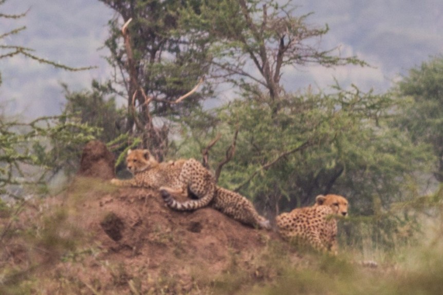 After looking at a single cheetah for a while, we went a little further and saw this group of cheetahs sitting atop a termite hill.