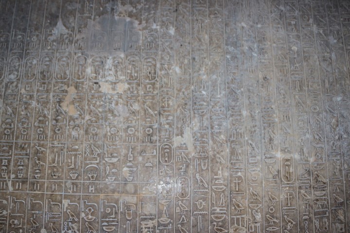 In the interior can be seen portions of the hieroglyphic spells of the Pyramid Texts up close. Later pyramid texts such as these were written onto papyrus scrolls and buried with Egyptians. These scrolls became known as the “book of the dead”.