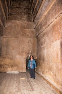 Holly leaning down to enter passageway leading to the Red Pyramid’s burial chamber. Unlike the tomb inside King Teti’s pyramid (which was much later than the Red Pyramid) Sneferu’s tomb inside the Red Pyramid does not contain any hieroglyphs. Writing on the tomb walls was a later development.