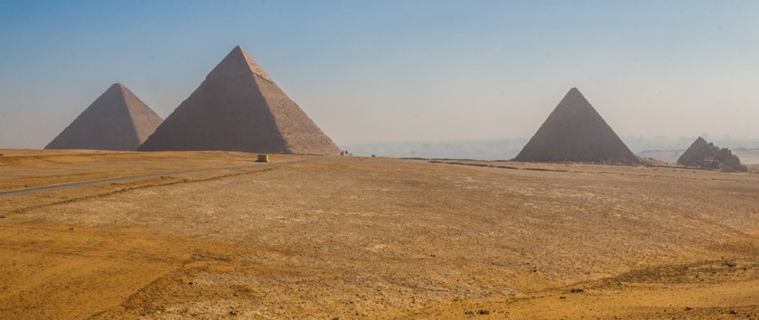 Here’s a view of the three major pyramids (left to right) the Great Pyramid of Khufu, the Pyramid of Khafre and the smaller Pyramid of Menkaure. To the extreme right the Queens’ Pyramids next to the Pyramid of Menkaure are visible.